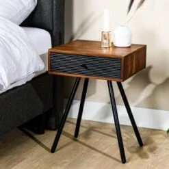 - Het nachtkastje heeft één lade, steunend op planken in het midden van het kastje waardoor de lade een zwevend effect krijgt