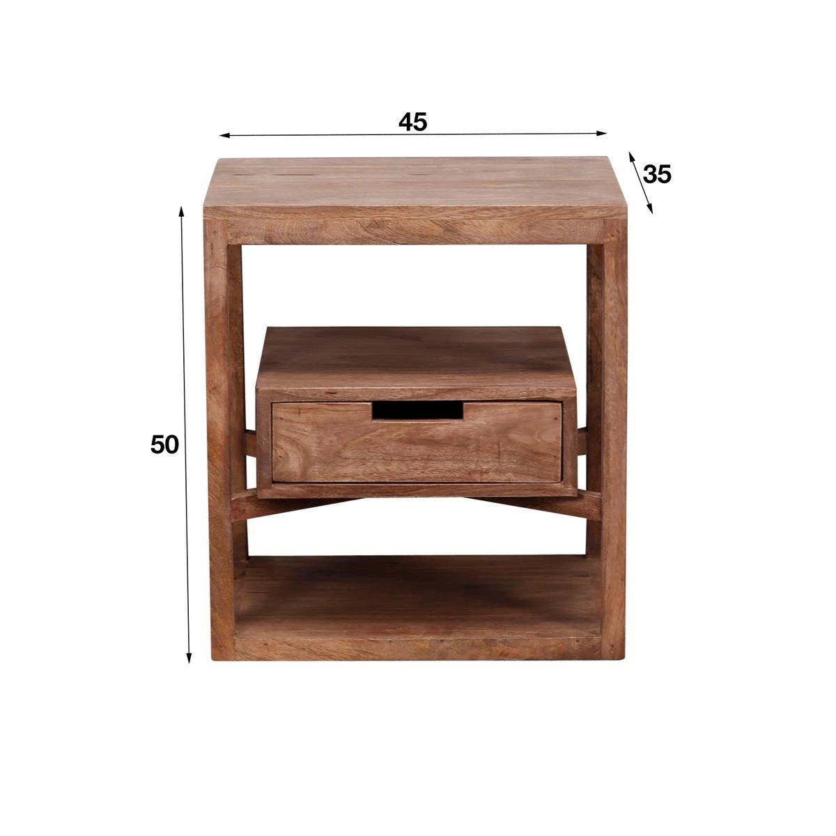 - Dit nachtkastje ‘Sahara’ is uitgevoerd in mango hout met een zandkleur