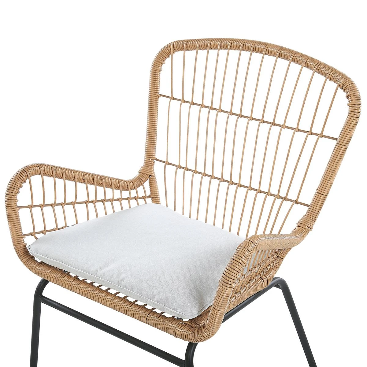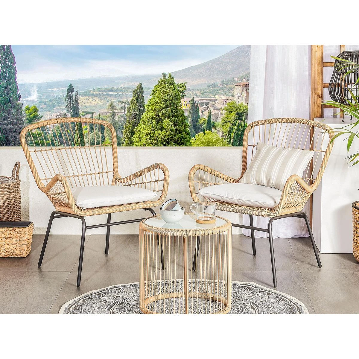 Deze zonnige tuinset met slanke vormen, een delicaat ontwerp en een luchtige look is precies wat je zoekt voor een afgelegen plek in de tuin of op het balkon. De 3-delige set bestaat uit twee comfortabele rieten tuinstoelen met prachtig gebogen arml