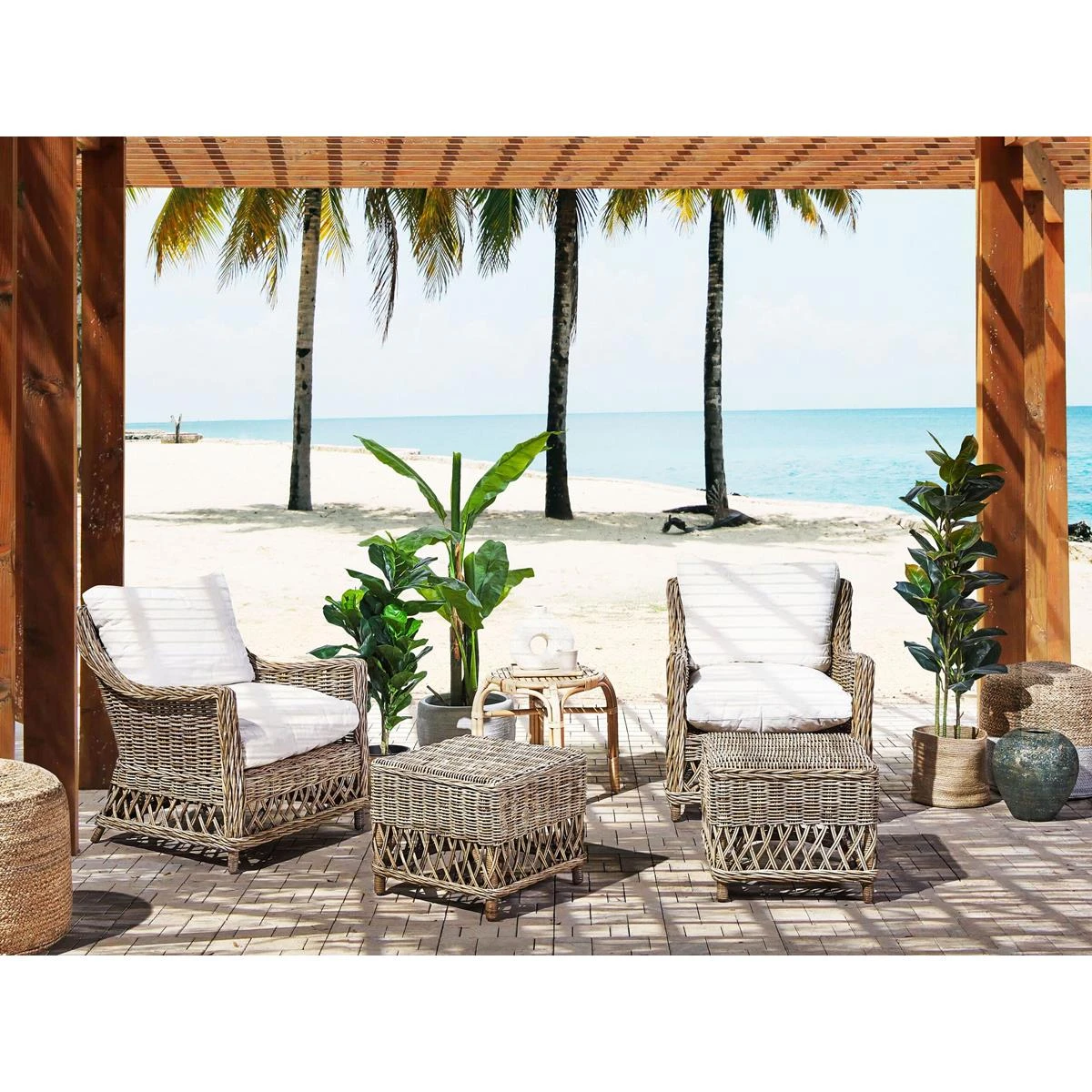 Belangrijkste eigenschappen: Comfortabele voetensteun, Elegant design, Gemaakt van natuurlijke, weerbestendige materialen, UV-bestendigheidsklasse, Geschikt voor binnen- en buitengebruik, Kussenhoezen met verborgen naden en ritsen, Beschermdoppen voor oppervlaktebescherming