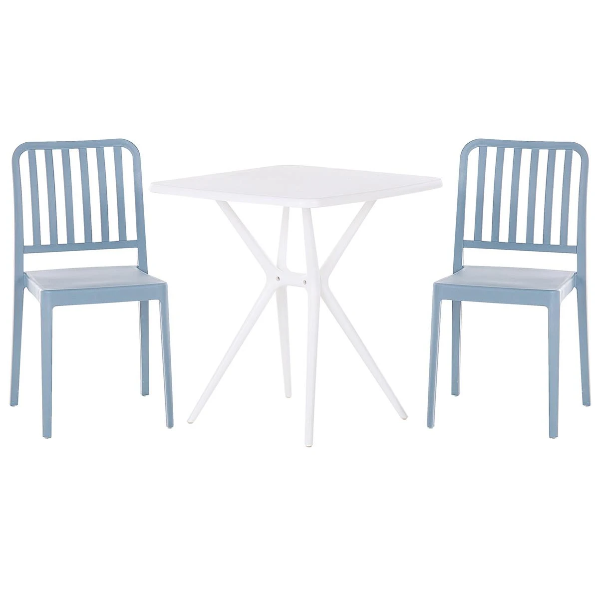 Zorg dat je klaar bent om van de zon te gaan genieten in je tuin of op je balkon met deze tafel en stoelenset. Al zijn elementen zijn gemaakt van duurzaam kunststof, zodat ze gemakkelijk te verplaatsen zijn. De vierkante tafel biedt genoeg ruimte om