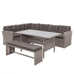 Tijdloze sfeer voor lange zomeravonden met familie en vrienden. Deze robuuste en tegelijkertijd gezellige lounge set gemaakt van grijs polyrattan is weersbestendig en slijtvast en dankzij de grote hoekbank en de praktische bank biedt deze ruimte gen