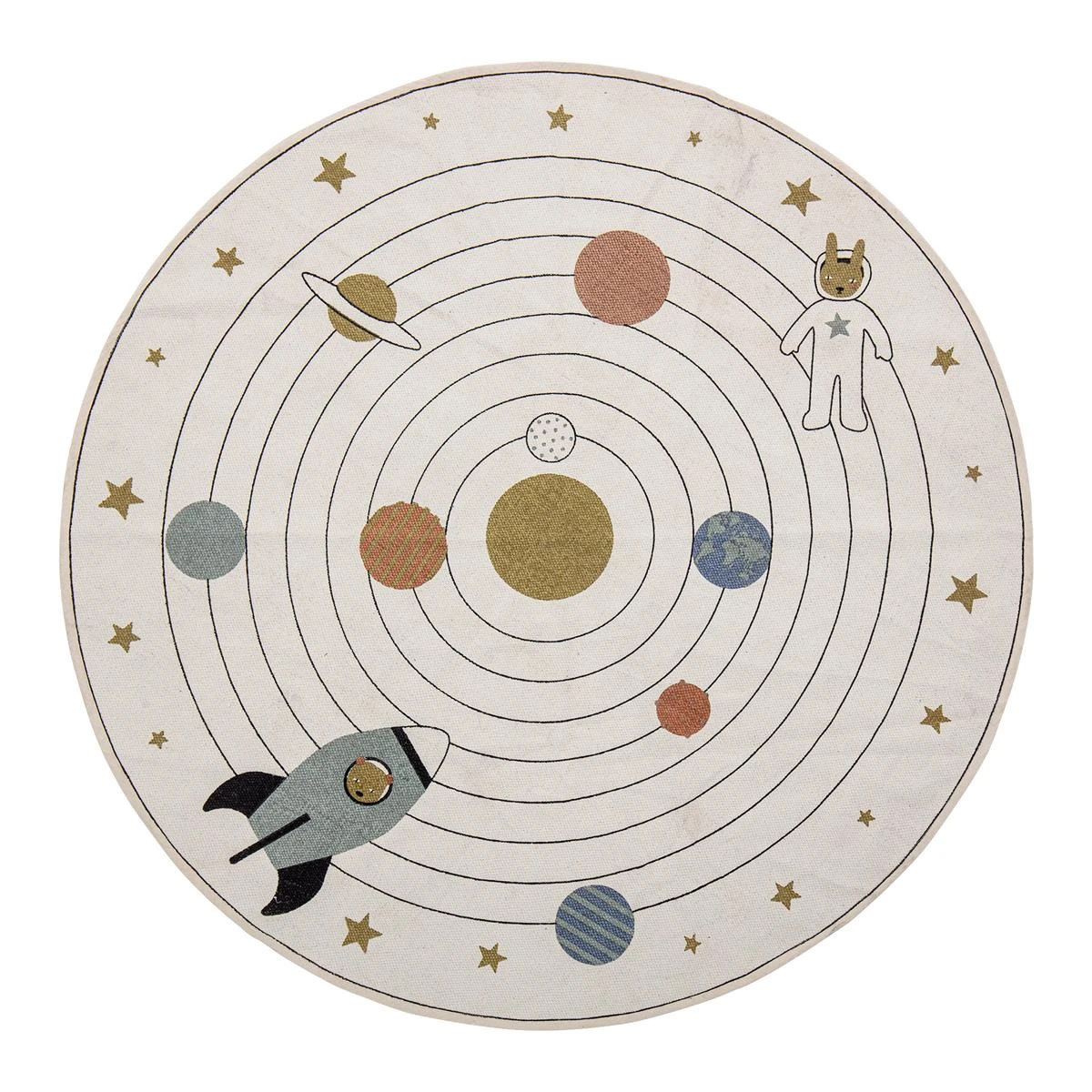 Planeten, astronauten en een ruimteschip… Alles vind je op dit vloerkleed en daarom staat hij extra leuk op de kinderkamer. Het ronde vloerkleed is gemaakt van katoen en overige materialen. Lekker voor je kleintje om op te spelen.