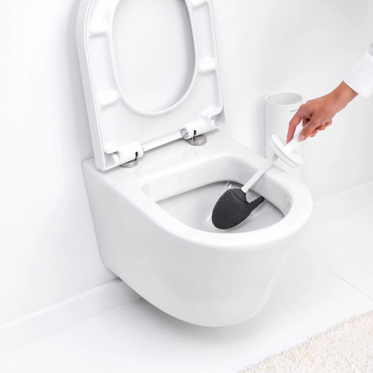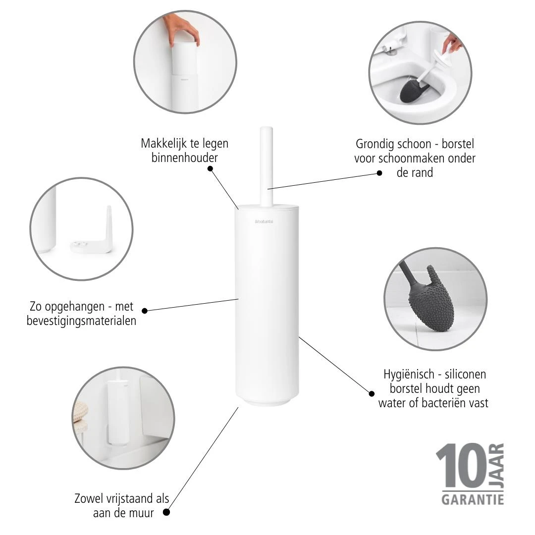 Met deze Brabantia MindSet toiletborstel maak je het toilet grondig schoon, ook tot onder de rand. De borstel is gemaakt van siliconen, waardoor water en bacteriën er zo van af glijden. Na gebruik zet je hem weg in de meegeleverde houder.
