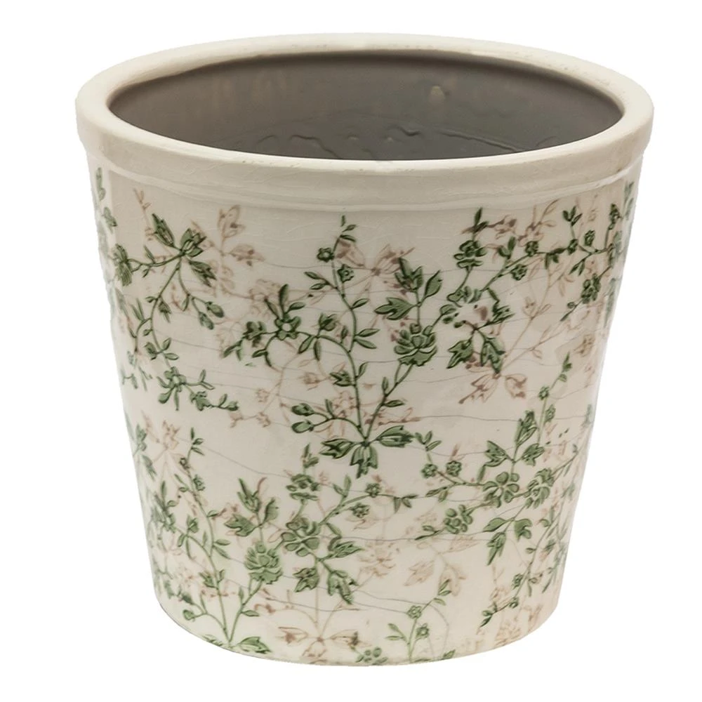 Mooi voor binnen, maar in de zomer ook voor buiten, decoratieve groen met beige keramieken bloempot met een bloemenmotief, in een landelijke stijl, van het merk Clayre & Eef.