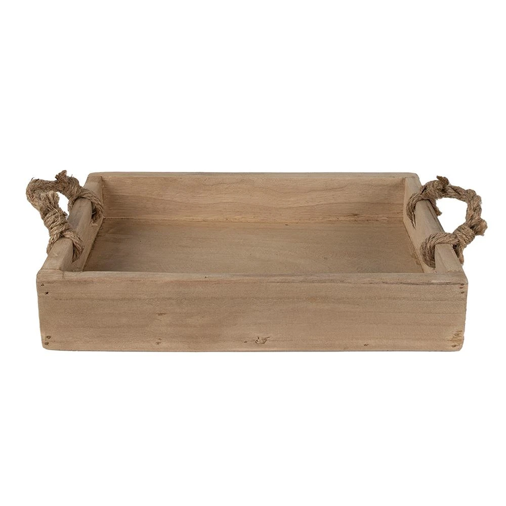 Decoratief, rechthoekig, bruin, houten dienblad, in een landelijke stijl, van het merk Clayre & Eef. De opstaande rand is 5 cm hoog. De handgrepen zijn van touw.