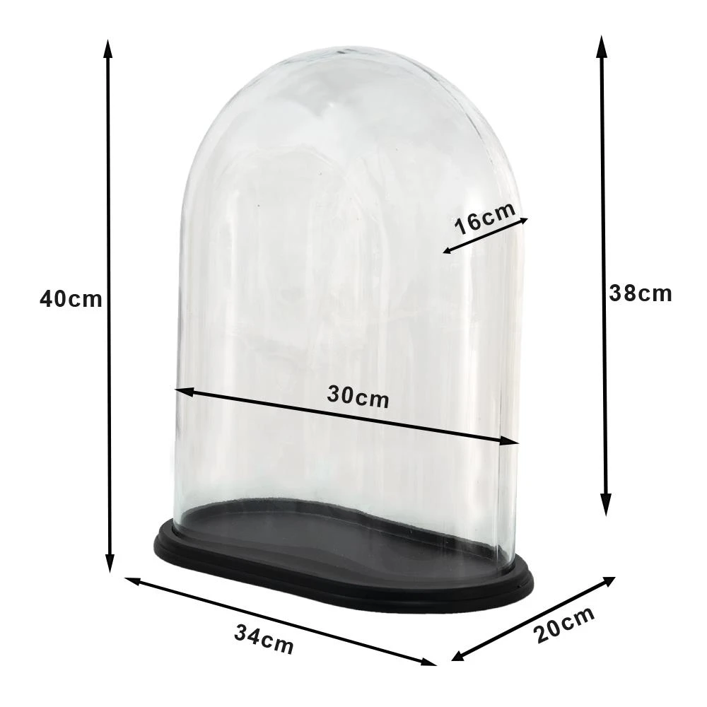 DECORATIEF GLAZEN STOLP: Onze glazen bel is 40 cm in hoogte (inclusief de basis) en heeft een totale basis diameter van 34×20 cm. De binnen diameter van het glas is 30×16 cm. De totale hoogte van het glas (exclusief basis) is 38 cm.