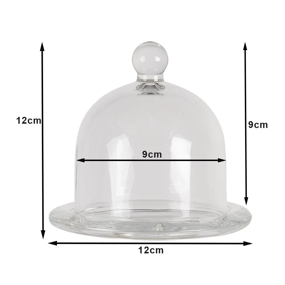 De glazen bel is 12 cm in hoogte (incl. de basis) en heeft een totale basis diameter van 12 cm. De binnen diameter van het glas is 9 cm en hoogte van het glas is 9 cm.