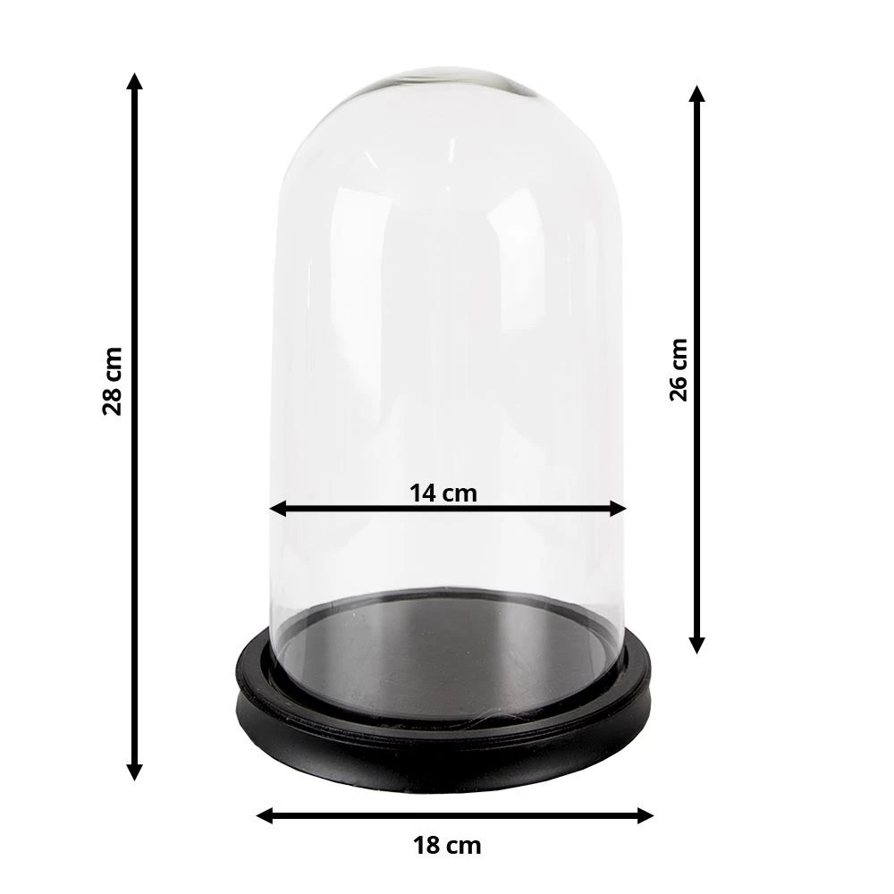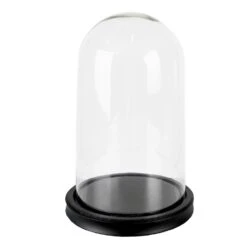 Mooie landelijke ronde glazen stolp op een zwart houten plateau van het merk Clayre & Eef. De binnenmaat van de stolp is Ø 14×26 cm en het plateau is 2 cm hoog.
