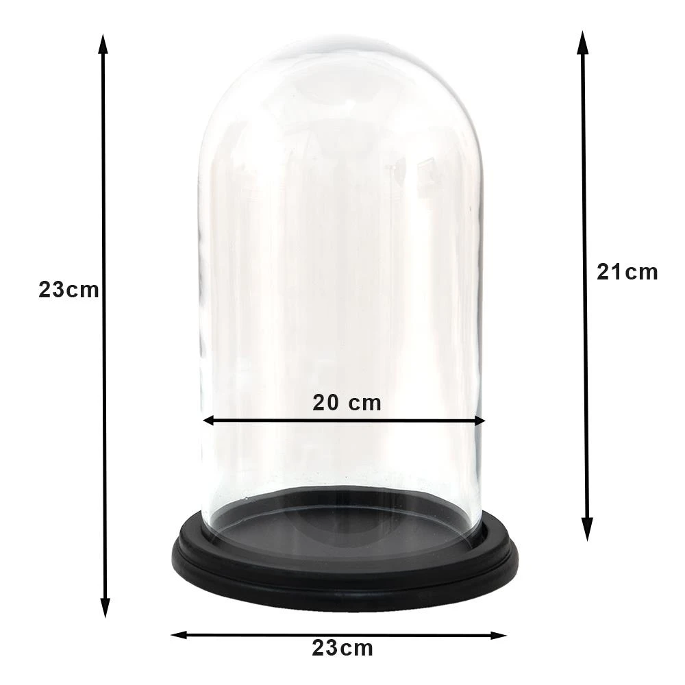 De glazen bel is 23 cm in hoogte (incl. de basis) en heeft een totale basis diameter van 23 cm. De binnen diameter van het glas is 20 cm en hoogte van het glas is 21 cm.