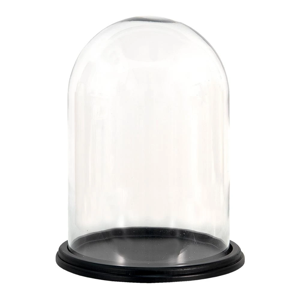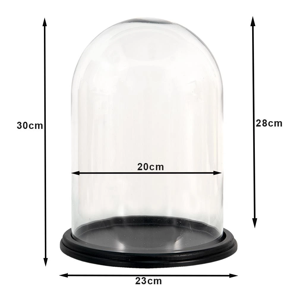 De glazen bel is 30 cm in hoogte (incl. de basis) en heeft een totale basis diameter van 23 cm. De binnen diameter van het glas is 20 cm en hoogte van het glas is 28 cm.