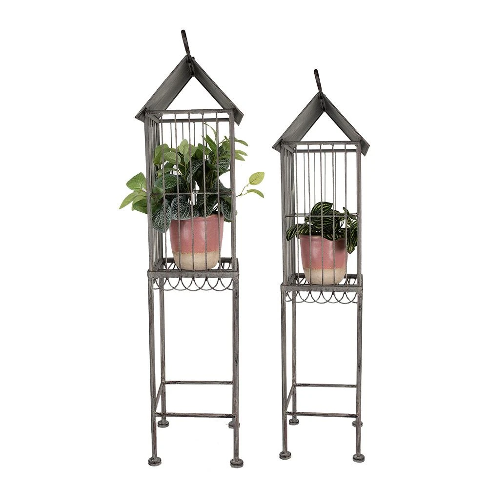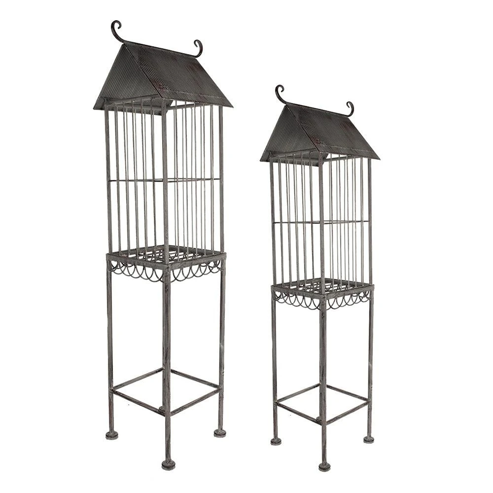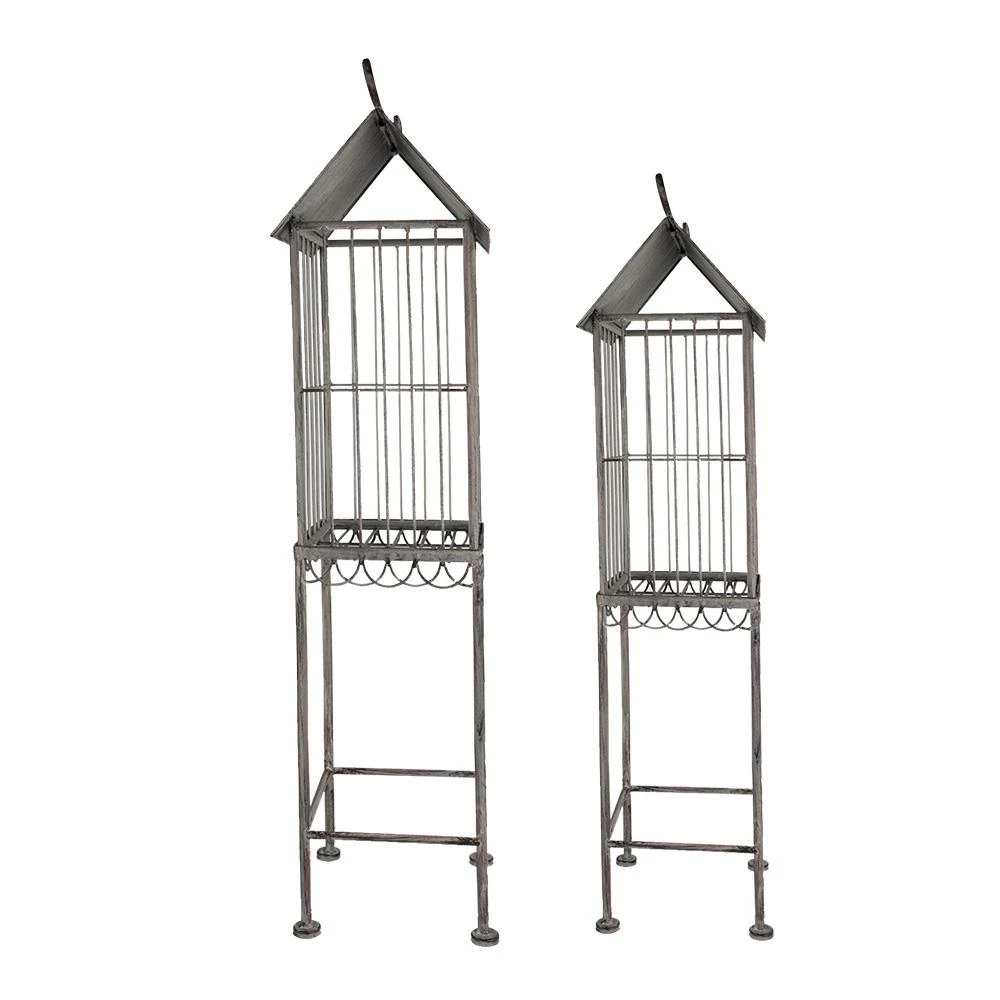 Set van twee landelijke grijze metalen vogelkooien van het merk Clayre & Eef. Afmetingen 35x26x117 / 27x21x99 cm.