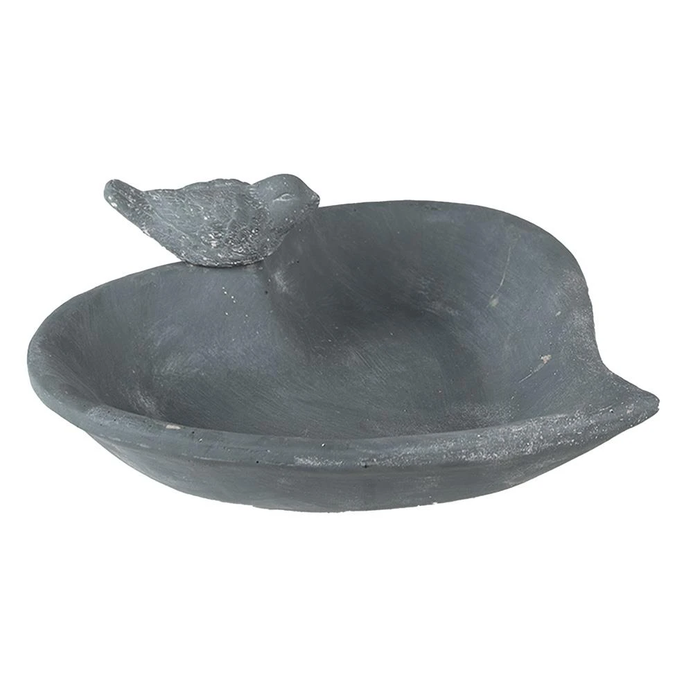 Decoratieve grijze stenen vogelvoederbak in de vorm van een hart, met op de rand één vogeltje, in landelijke stijl, van het merk Clayre & Eef. Niet waterdicht.