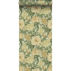 Haal veel warmte en sfeer in huis met dit behang met vintage bloemen in groen en okergeel. Dit dessin heeft een prachtige matte look en is perfect voor een stijlvolle, romantische accentmuur.Afmetingen, herhaling en aansluiting