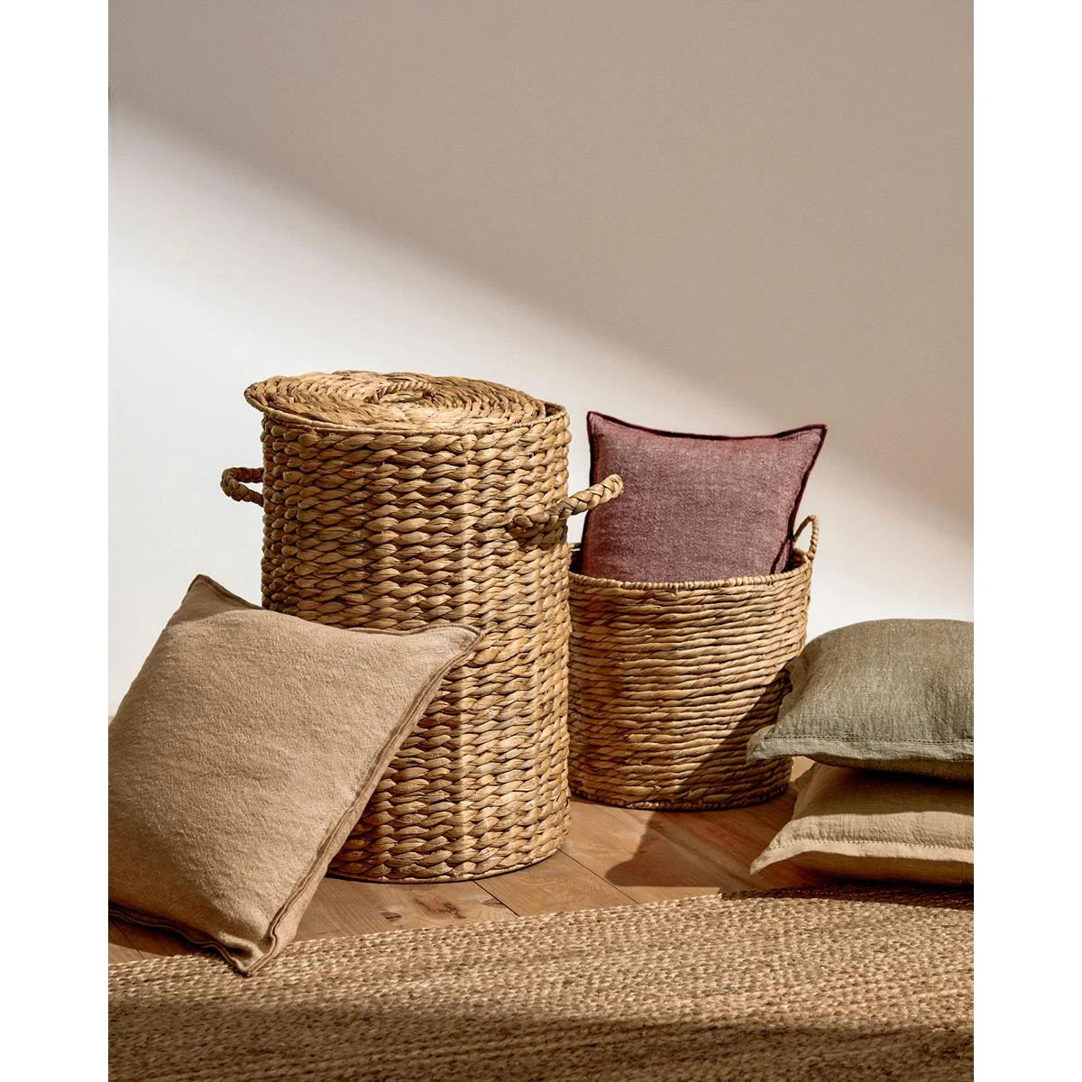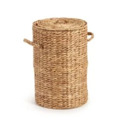 - Mand met handvatten en deksel gemaakt van handgeweven waterhyacint.
