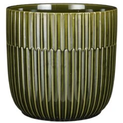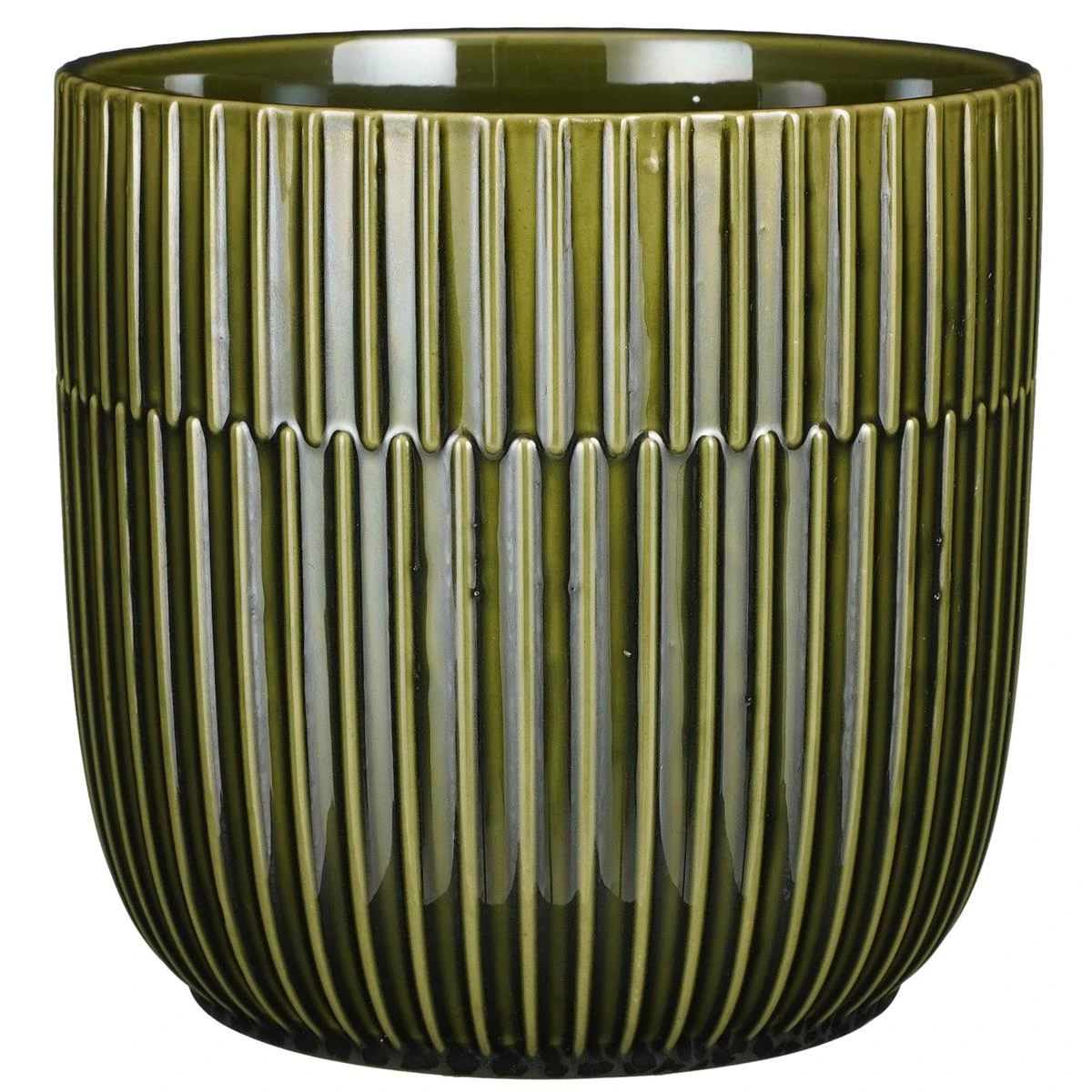 Plantenpot/bloempot van keramiek in de kleur glans donkergroen met een mooi verticale strepen patroon. Diameter 19 cm en hoogte 18 cm. Stijlvolle bloempotten voor binnen gebruik. Serie: Sara. De stijlvolle pot met het prachtige patroon aan de buitenz