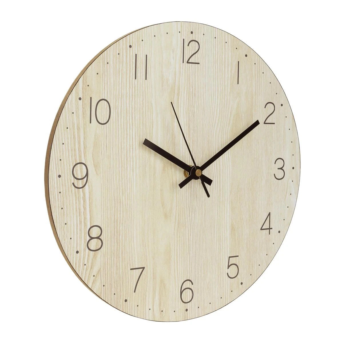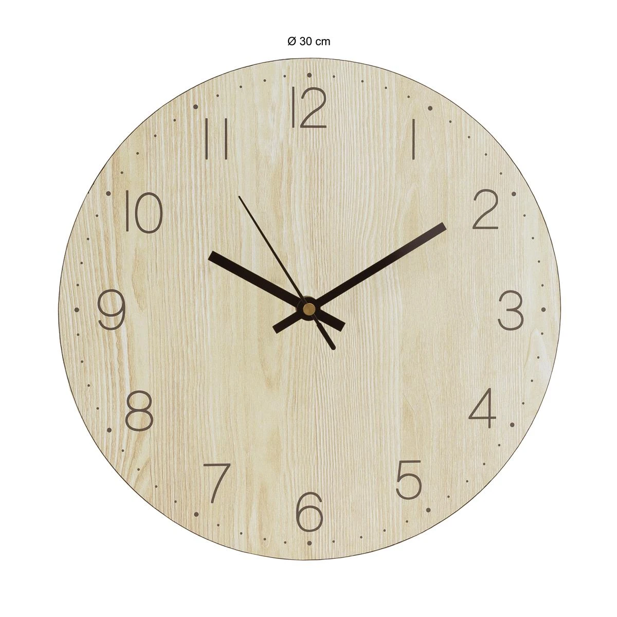 De wandklok voor binnen is gemaakt van lichtbruin hout, heeft zwarte wijzers en heeft een diameter van maar liefst 30 centimeter.