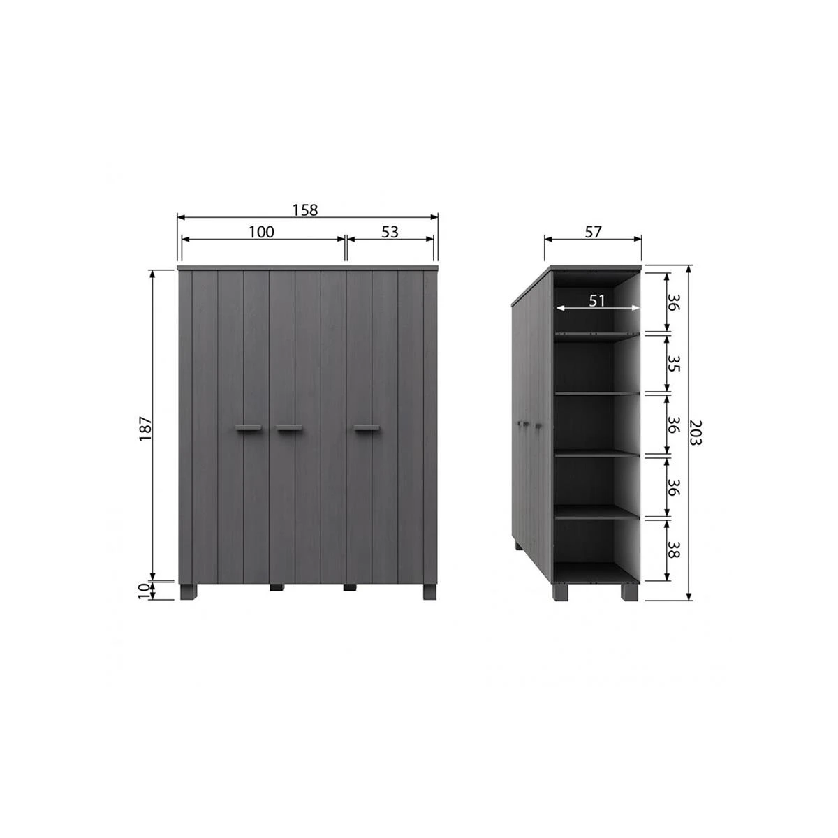 Het interieur van de kast bestaat uit (hanggedeelte) één brede legplank van 100 cm met daaronder een roede en (leggedeelte) 4 legplanken van 53 cm breed. Deze 3-deurs kast Dennis heeft een gewicht van 96,6 kg.