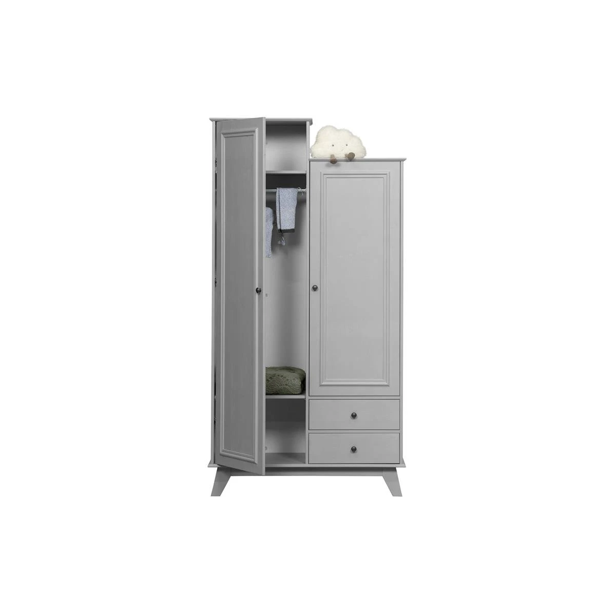 Deze Lily garderobekast is door zijn asymmeterische ontwerp speels, maar met een klassiek uiterlijk. Lily is een eigen ontwerp en komt uit de collectie van het merk WOOOD. De garderobekast is gemaakt van grenen dat is afgewerkt in een warm grijze kleur. De kast is voorzien van twee lades voorzien van een zwart metalen knop greep en twee deuren voorzien van een zwart metalen knop greep. Vanwege de asymmetrische hoogte van de kast geeft Lily een speels effect, maar door de klassieke uitstraling is het een tijdloze kast.