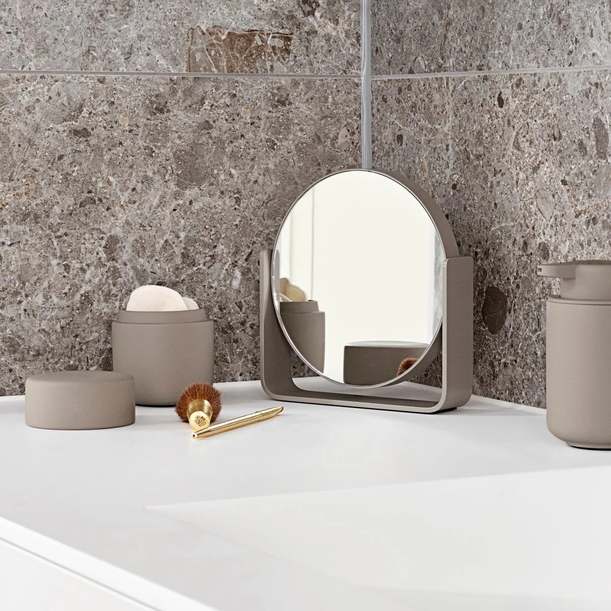 Deze geweldige Zone Denmark Ume tafelspiegel heeft aan een kant een normale spiegel, terwijl de andere kant 5x vergroot. De spiegel draait veilig om z’n eigen as, gedragen op een breed aluminium frame dat tevens dient als stabiele basis.