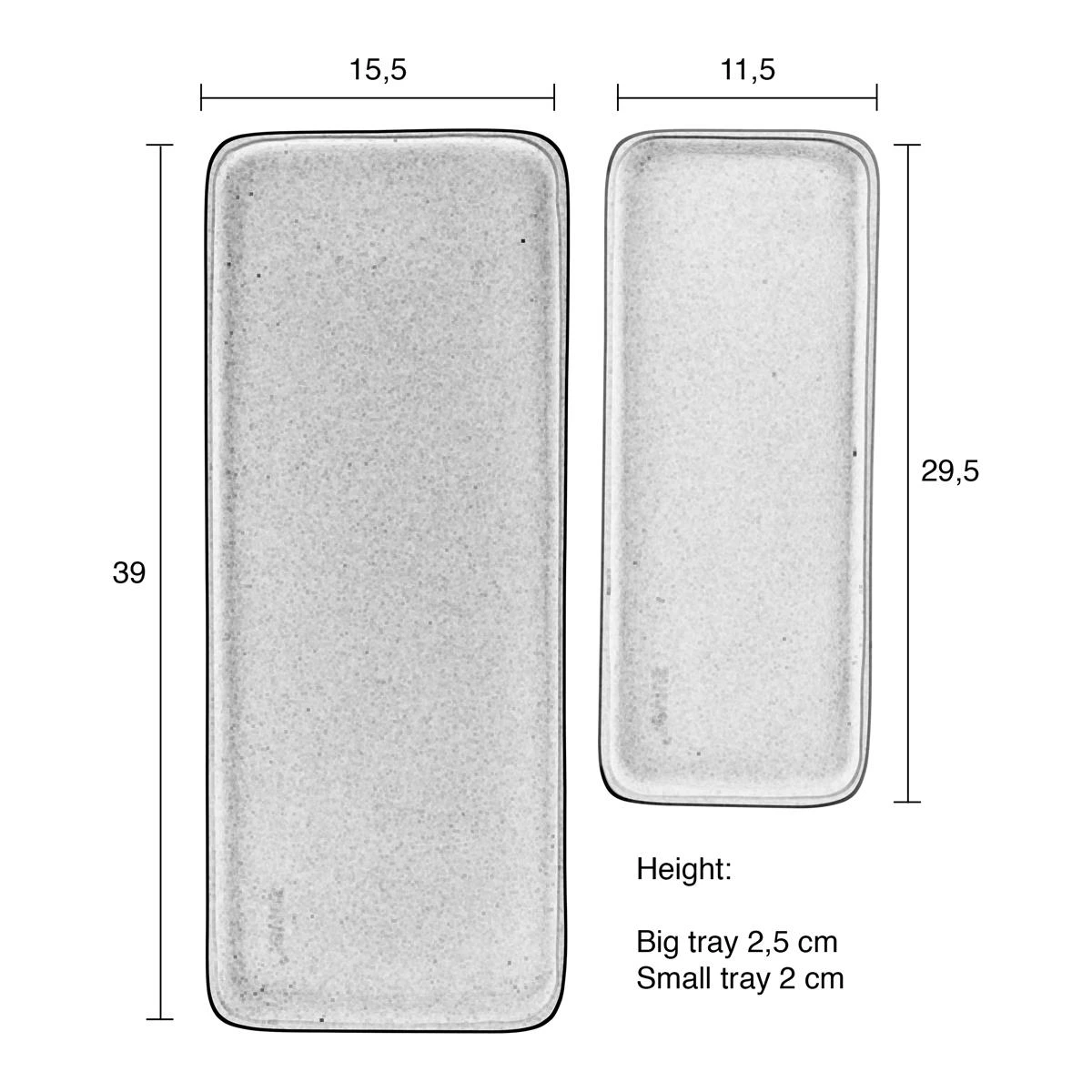 - Het grote dienblad meet: H 2,5 x B 39,5 x D 15,5